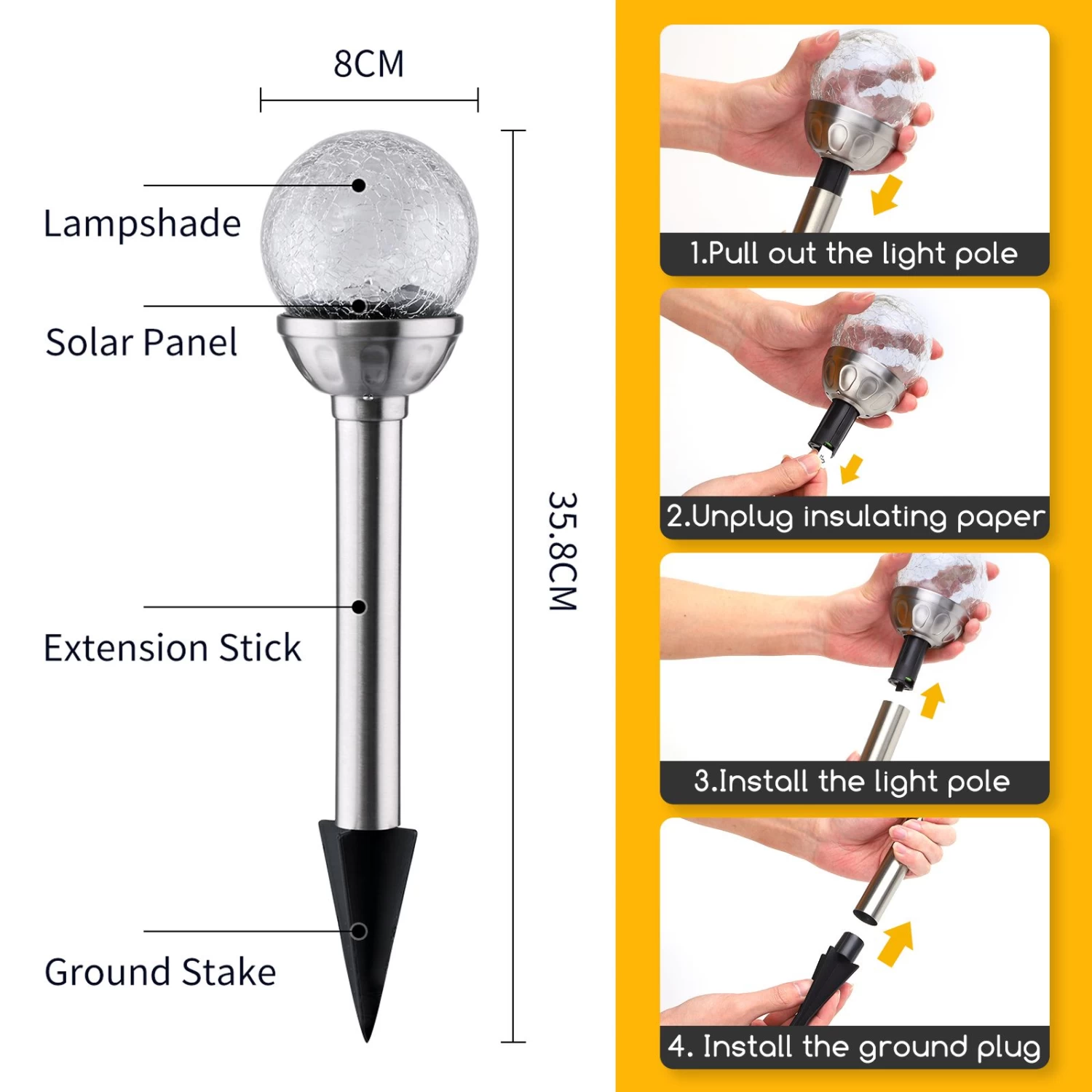 ☀️fácil instalación: no necesita cables ni enchufes, solo hay que clavarlo en una superficie blanda. Su tamaño: 8x8x35,8cm le permite adaptarse a cualquier espacio△☀️materiales de calidad: fabricado en vidrio & plastico & acero inoxidable de alta calidad, resiste el sol y la lluvia ya que además dispone de protección ip44△☀️sensor día/noche: obtiene su energía de la luz solar mediante su panel solar. Se enciende automáticamente de noche△☀️iluminación cálida: su bombilla led es ofrecen de luminosidad y una potencia de 0.08w, perfecto como luz guía en el exterior△ ☀️batería de larga duración: ilumina durante 8 horas, tras una carga solar completa de una duración de 5 horas.