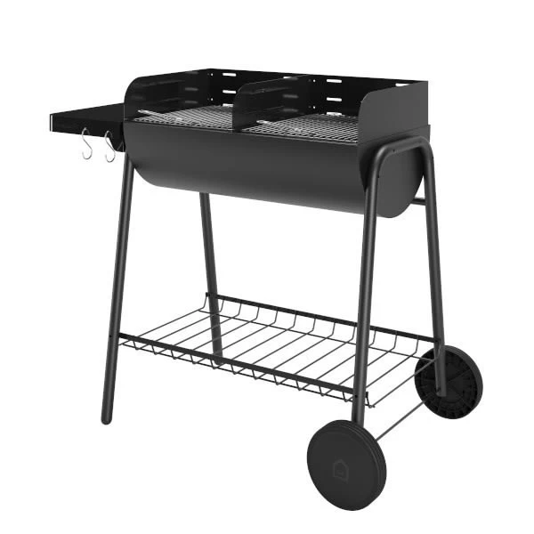 La barbacoa de carbón Pondera es apta para 10 comensales. Cuenta con doble parrilla para combinar alimentos. Fabricada en acero pintado color negro.Dispone de ruedas para su fácil transporte, siendo muy manejable y adaptable a cualquier espacio.Las barbacoas de carbón son muy prácticas para cocinar en el jardín o la terraza. Disfrutarás de buenos momentos en familia o con amigos.Medidas: Alto 98 x ancho 119,5 x profundidad 67 cm.Dimensión parrilla: ancho 37 x fondo 39,5 cm. Incluye 2 parrillas con asa, bandeja lateral con 2 ganchos y parrilla inferior de apoyo.