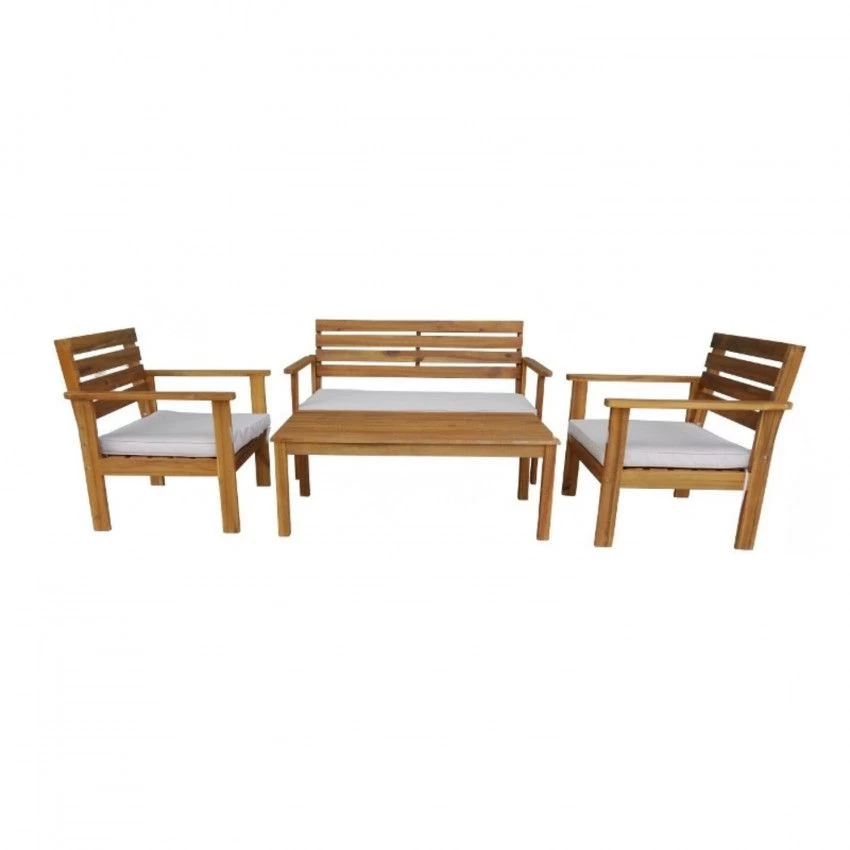 Este elegante conjunto de jardín está compuesto de 4 piezas: 1 mesita baja, 2 sillones y 1 sofá de dos plazas. Todas ellas fabricadas en madera de acacia natural con acabado mate, así que si eres natural lover, marlon está hecho para ti. Para que disfrutes de la máxima comodidad, tanto los sillones como el sofá incluyen mullidos cojines de color blanco. Este contraste de colores y materiales es capaz de crear un ambiente fresco que te invita al relax.