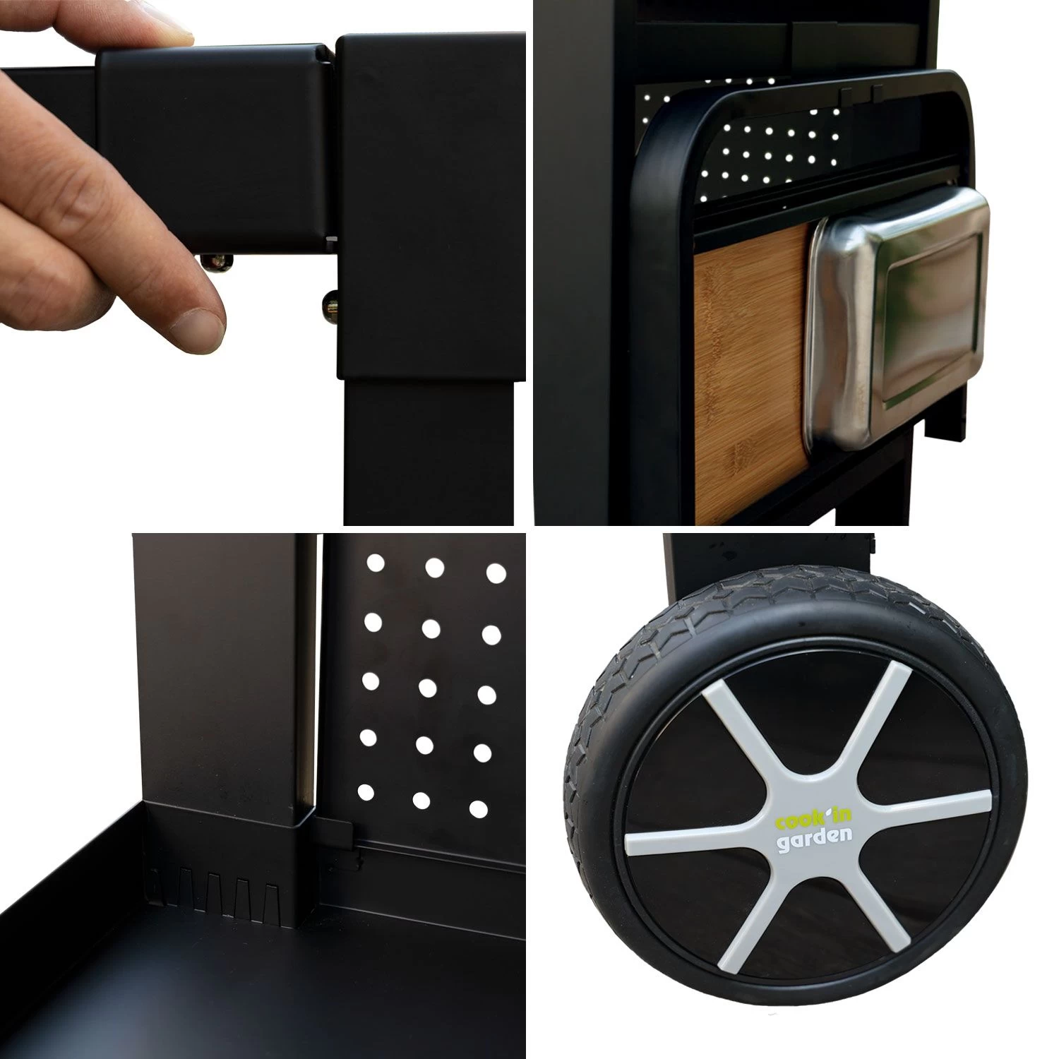 descripción :elija un accesorio de jardín completo para ayudarle a preparar sus comidas de verano. Este carro de jardín es fácil de trasladar de la cocina a su terraza gracias a sus dos ruedas, lo que le permite llevar todo lo que necesita para hacer sus parrilladas de plancha. Dispone de dos placas perforadas, una de las cuales puede utilizarse como credenza para proteger la placa de cocción del viento. Esto significa que tiene una superficie de trabajo, una bandeja baja y un estante lateral, que se puede plegar para ahorrar espacio al guardar el carro. Este carro de plancha está equipado con accesorios como una tabla de cortar, una bandeja de especias, ganchos, etc.detalles del producto :dimensiones :- aparador : l 121 × an 65 × al 110 cm- superficie de trabajo : l 108 × an 55 cm- altura entre estantes : al 61,5 cm- grosor de la bandeja : 8 cm- ruedas : ø 17 cmmateriales :- estructura : acero epoxicolores :- marco : negro- estante : negroopciones :- 1 falda- 1 armario- 1 especiero- 1 estante con tabla de cortar- 1 bandeja de carne- 1 soporte para papeleras- 1 rueda reforzadainformaciones complementarias :- peso máximo soportado : 50 kg (estante alto) / 25 kg (estante bajo)- estantería con clip : montaje en 10 minutos sin herramientas- compatible con la cubierta protectora : ac002- para montar (instrucciones incluidas)- garantía : 3 añosentrega :la mesa de plancha reva 110 premium contiene : 1 mesaentrega a pie de calle – entrega en 1 paquetepaquete 1 : l 86,5 × an 64 × al 12,5 cm – peso bruto : 28,5 kg / peso neto : 24,7 kg