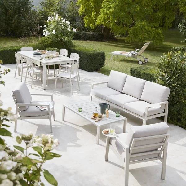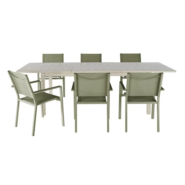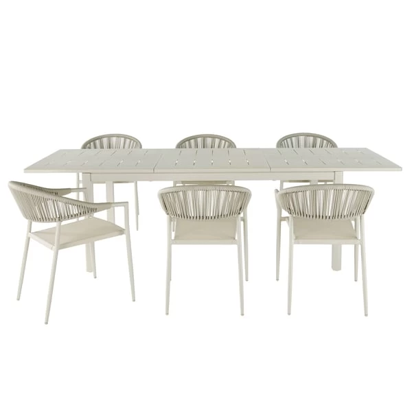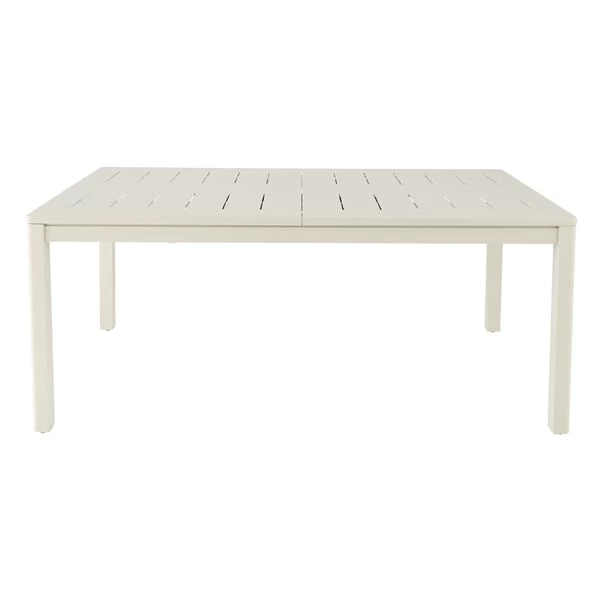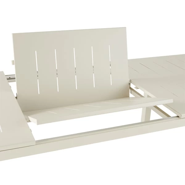 Esta elegante mesa extensible de nuestra gama Santorin está diseñada con bordes redondeados, creando líneas suaves que le otorgan un aspecto moderno. Está fabricada en aluminio, que la hace más duradera y facilita su mantenimiento. Gracias a su opción extensible tipo libro, esta mesa de jardín extensible tiene capacidad para 8 personas. Se puede combinar con otras piezas de la gama Santorin -sillas- para completar el look.Forma rectangular y extensible en parte central, hasta 2,6 m de longitud.Capacidad: 6-8 personas.Requiere montaje: accesorios y fijaciones incluidas.Orificio para parasol: 5 cmColor: beige Peyote.Resistente a la intemperie, oxidación y al agua.