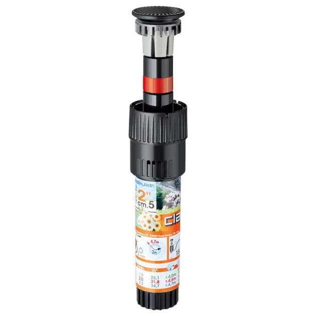 Modelo: Microaspersores 360° Claber.Medidas: Altura 143 x Ø 40 mm.Material: Acrilonitrilo butadieno estireno (ABS) y Polioximetileno (POM).Color: Negro.Presión máxima/mínima de funcionamiento: 2,5-1,5 bares.Flujo: Regulable.Área máxima de riego: 50 m².Ancho máximo del chorro: r 4,5.Caudal: 4,5 l/min a 2 bares.Ángulo de riego: 360°.Diámetro rosca entrada: 1/2″.Tipo de riego: Enterrado.Garantía: 2 años.Uso: Sirve para regar con agua muy fina, incluso con baja presión. Ideal para regar huertos y jardines pequeños. Efecto lluvia suave sobre una zona circular de 360°….