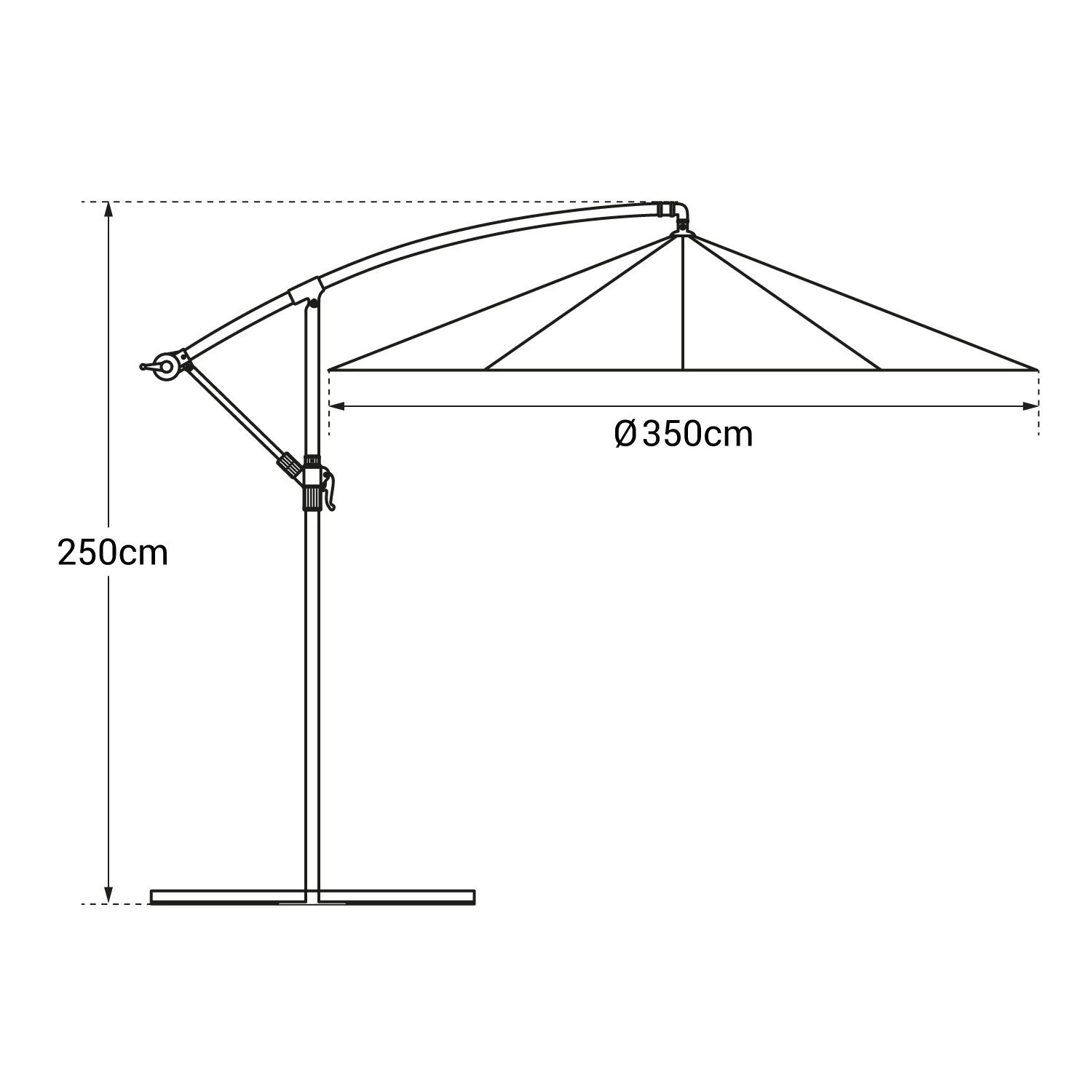 descripción :con una línea clásica y elegante, con nuestra sombrilla oahu de 350 cm, estará protegido de los rayos del sol y podrá disfrutar de su jardín, su terraza o su balcón con total tranquilidad… Robusta con su estructura de acero pintado en epoxi y práctica apertura con su manivela, todas las ventajas de nuestra sombrilla le seducirán. No te olvides de añadir placas con peso o relleno para que el parasol excéntrico se mantenga en el suelo.detalles del producto :dimensiones :- sombrilla : ø 3,5 × al 2,5 m- base : l 100 × an 100 × al 4,5 cm- mástil : ø 48 × esp. 0,8 mm- brazo articulado (largo) : ø 42 × esp. 0,8 mm- brazo articulado (corto) : l 26 × an 16 × esp. 0,8 mm- varillas : l 18 × an 12 × esp. 0,5 mm- funda : ø 30 a 54 (de arriba a abajo) × al 218 cmmateriales :- tela : poliéster 180 g/m²- mástil, brazo articulado y base : acero, pintura epoxi- varillas : acero- funda : poliéster, 140 g/m² colores :- tela : color rojo- mástil, brazo articulado, varillas y base : antracita- funda : color negro informaciones complementarias :- tipo de sombrilla : excéntrica- forma de la tela : redonda- número de ballenas : 8- tela repelente al agua- ventilación en la parte superior- sistema de apertura/cierre : manivela- forma de la base : cruz- protección solar : tratamiento uv20+- funda impermeable y repelente al agua- sin montar (instrucciones incluidas)- garantía : 3 añosentrega :la sombrilla excéntrica oahu contiene : 1 sombrilla y su funda protectoraentrega a pie de calle – entrega en 1 paquetepaquete 1 : l 198 × an 32,5 × al 14 cm – peso bruto : 14,5 kg / peso neto : 13 kgbueno saber :las bases de sombrilla necesarias para asegurar su estabilidad se venden por separado
